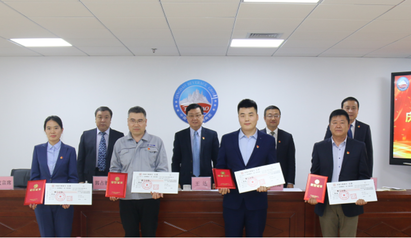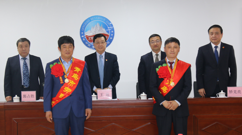 集(jí)團黨委書記、董事長王達為獲得“2015-2017年度青島市勞動(dòng)模範”榮譽稱號的青島嶗山礦泉水有限公司仰口生產經理陶煉(liàn)、青島華東葡萄釀酒(jiǔ)有限公司生產部設備主管張光臣頒獎。
